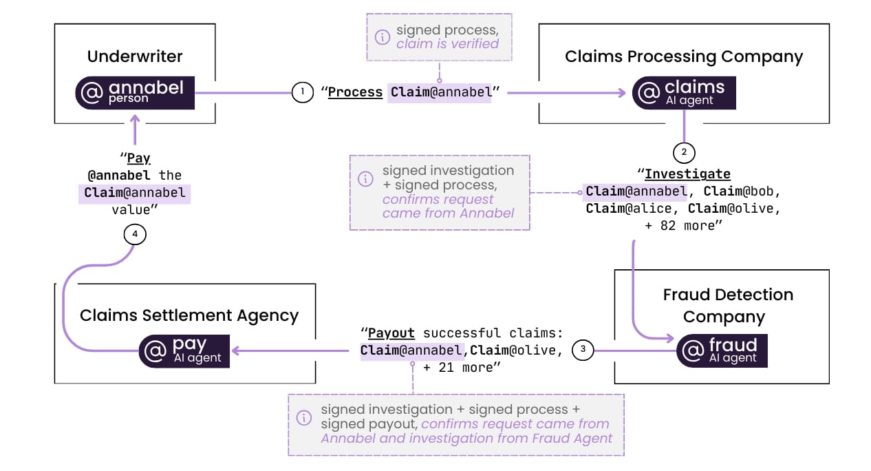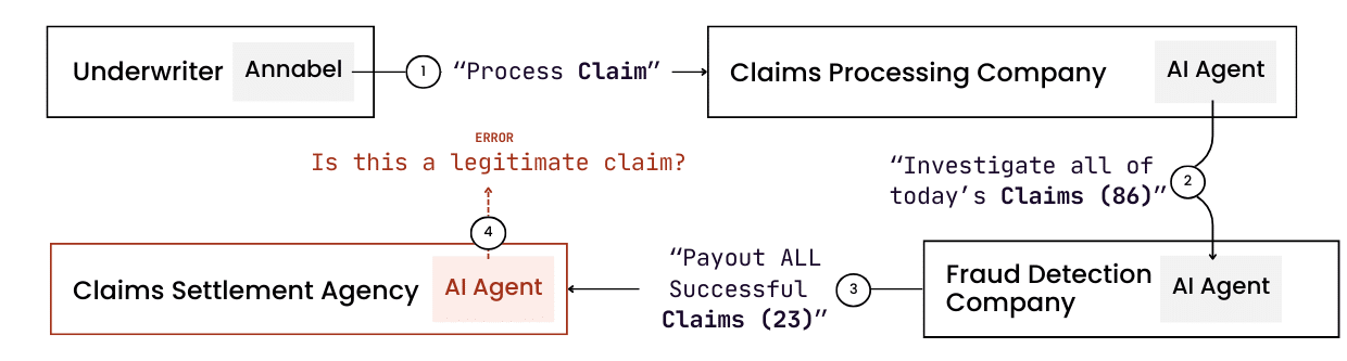 A human underwriter named Annabel at Global Insurers, Inc., instructs a Claims Processing AI agent, ‘ai-claims’ (hosted at a partner firm), to process a claim. That agent then coordinates with ‘ai-fraud’ at a third-party service and ‘ai-pay’ at a settlement agency. The critical question arises: How can “ai-pay” verify that this request truly originated from Annabel, an authorized human at a completely different company, without a direct line of sight?